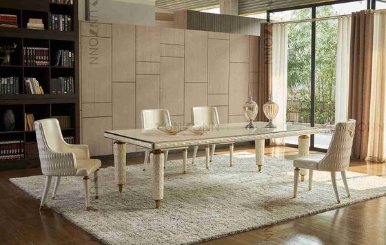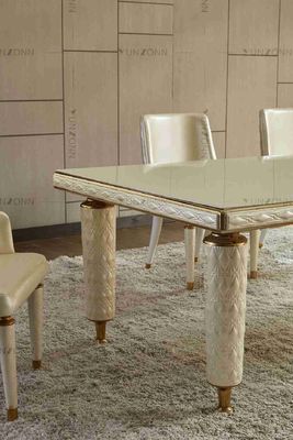 میز ناهار خوری با روکش چرم گلدوزی با قاب استیل ضد زنگ با روکش شیشه ای سفید رنگ برای خانه