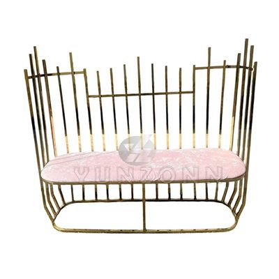 یک مبل عروسی پشت بلند با کیفیت ممتاز با روکش طلایی، دارای طراحی برجسته و برجسته و روکش PU لوکس با قاب فولادی ضد زنگ.