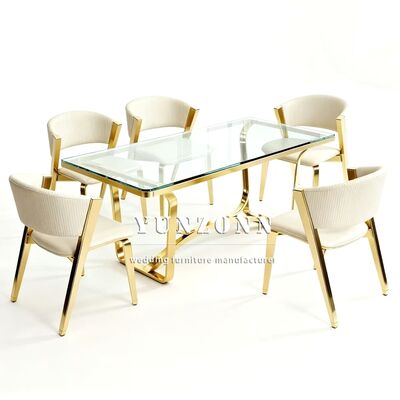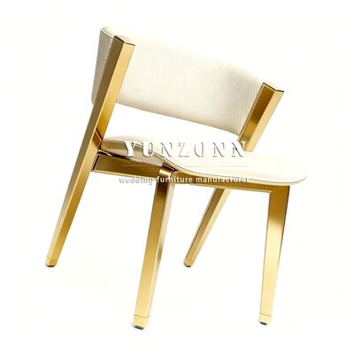 | نام محصول: | صندلی های غذاخوری لوکس و مجلل رستوران، طراحی طلایی از جنس استیل ضد زنگ، کوسن های چرمی چند رنگ، مبلمان عروسی فلزی |