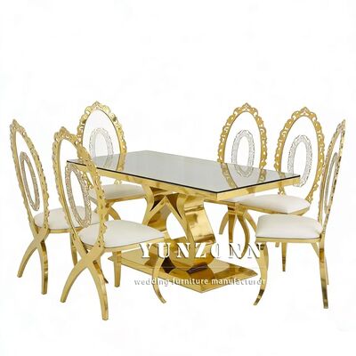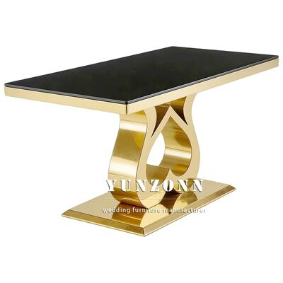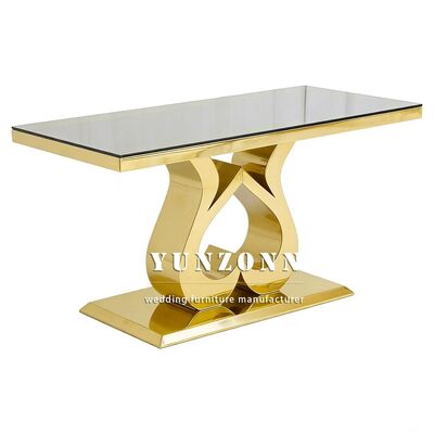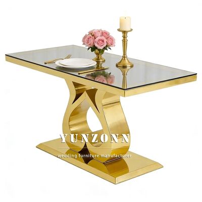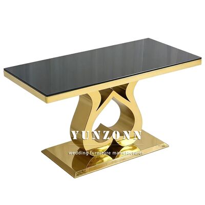 | نام محصول: | مبلمان رویدادهای هتل ارزان قیمت، میز عروس و داماد، میز پذیرایی عروسی مستطیل شیشه ای استیل طلایی |
