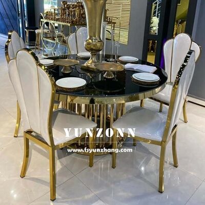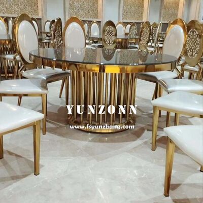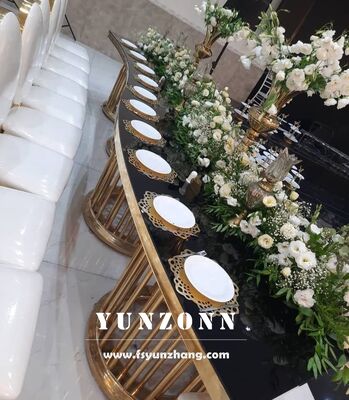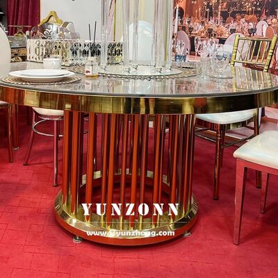 | نام محصول: | میز لوکس هتل از جنس فولاد ضد زنگ با پایه طلایی و رویه شیشهای برای مراسم عروسی (مدل مارپیچ/گرد) |