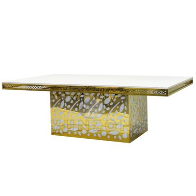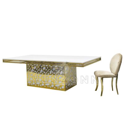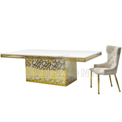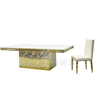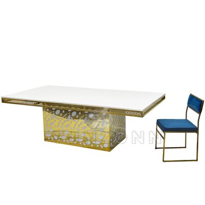 میز ناهار خوری لوکس هتل از جنس فولاد ضد زنگ با آویز کریستالی و شیشه طلایی برای عروسی و رویدادها، ضیافتها، رستورانها و مهمانیها |